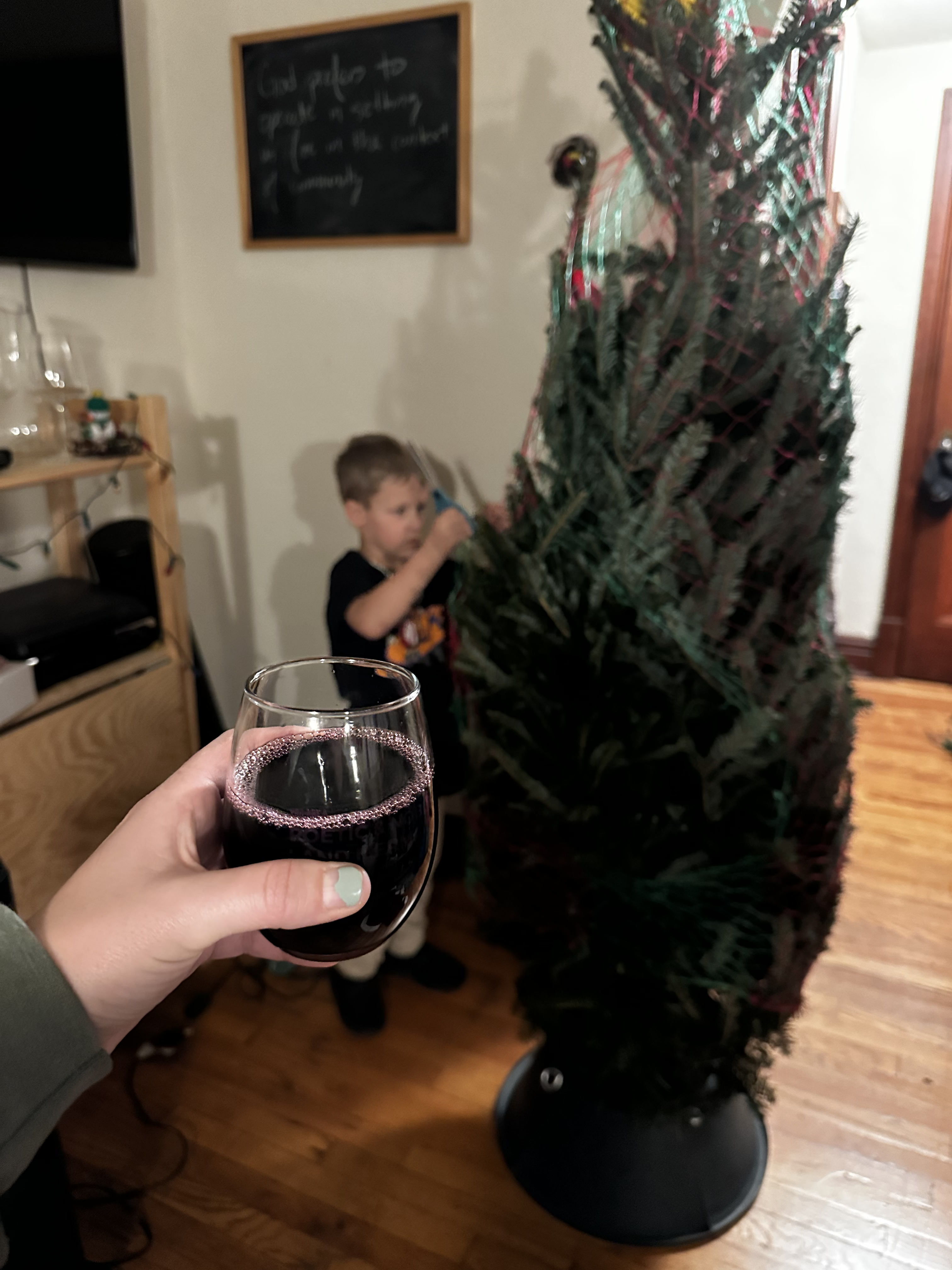 The next afternoon I sent a Marco Polo to my friends showing them the tree and giggling about how disorganized it was. I mentioned that I had thought about changing it after the kids left, to make it look a bit more put together. But I had decided against it because 1) I’m lazy and 2) us adults are always coming in trying to fix what kids bring to the table and I just didn’t want to do that with this sweet tradition we had just participated in together.